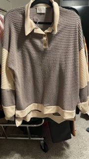 Add this soft Cream & Taupe waffle shirt to your wardrobe. The unique collar adds a playful twist to this piece, perfect for those who don't take their fashion too seriously. (No pun intended!)